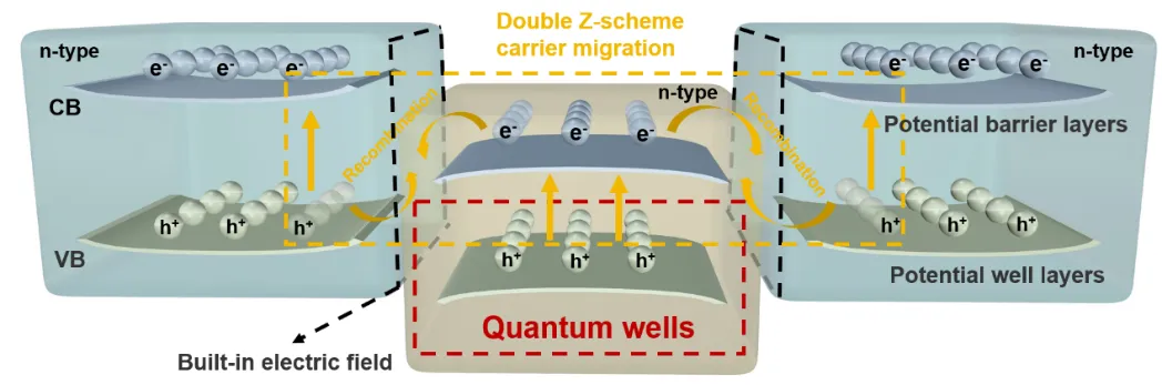 图1展示了量子阱结构示意图,n 型半导体主要通过带负电荷的电子导电。当两个功函数不同的 n 型半导体在表面紧密接触时,就会形成 n-n 型异质结。接触后,在界面处会建立一个内建电场。在弯曲能带和内建电场的协同作用下,异质结内会出现 Z 型载流子迁移机制。这种机制有利于光生电子和空穴的空间分离,同时保持强大的氧化还原能力。因此,构建 A-B-A 交替异质结能够形成双 Z 型载流子迁移路径,从而有效地实现量子阱结构。