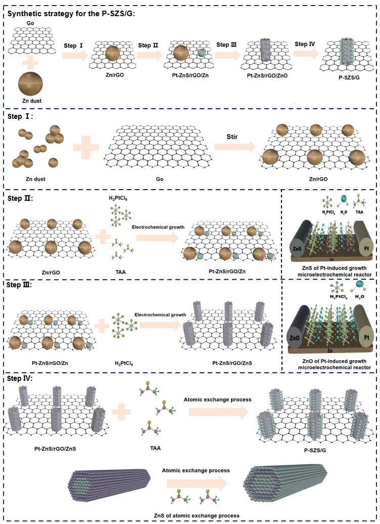 图2展示了P-SZS/G异质结的四步合成策略:步骤 I:通过 Zn 球与 GO 溶液之间的氧化还原反应制备 Zn/rGO;步骤 II:在含 S²⁻ 的水溶液中,以 Pt|H₂O|H₂ 为阴极、Zn|TAA|ZnS 为阳极建立微电化学反应器,使 Zn dust逐步转变为 ZnS,最终得Pt-ZnS/rGO/Zn。