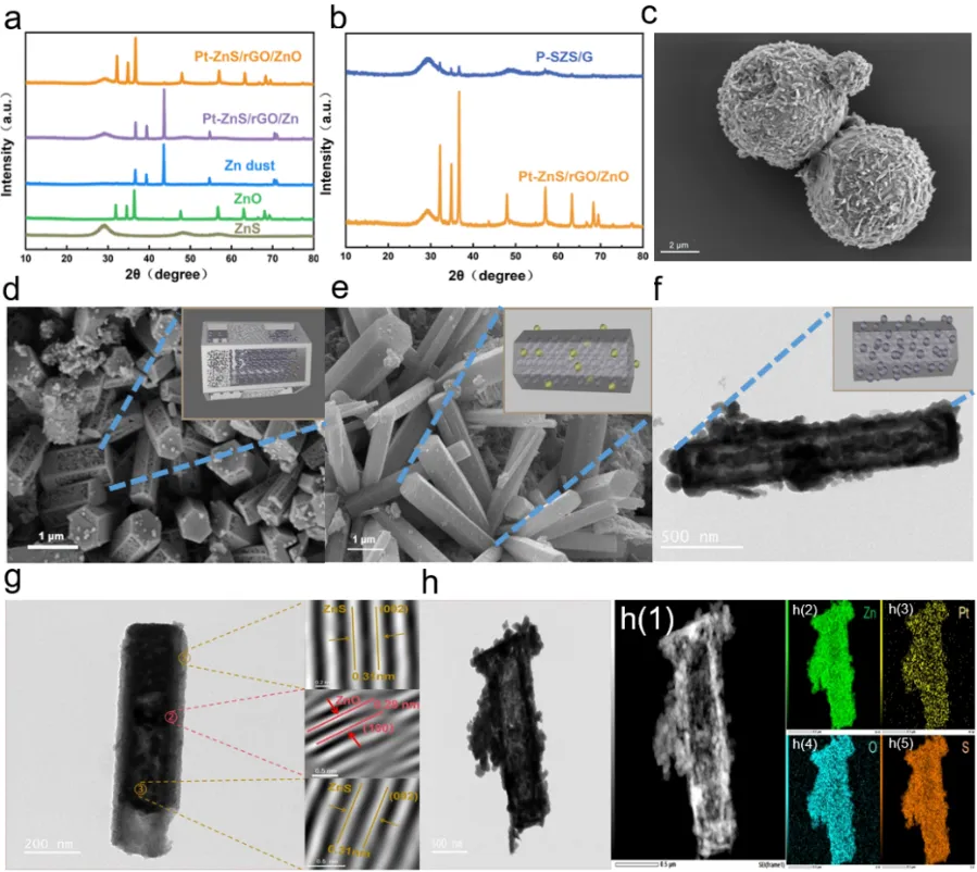 图2. (a)Zn dust、ZnS、ZnO、Pt-ZnS/rGO/Zn 和 Pt-ZnS/rGO/ZnO XRD 图谱;(b)Pt-ZnS/rGO/ZnO 和 P-SZS/GXRD 图谱;(c)Zn dustSEM 图像;(d)被ZnO包裹的ZnS SEM 图像;(e)Pt-ZnS/rGO/ZnO SEM 图像;(f)P-SZS/G TEM 图像;(g)P-SZS/G 的高分辨率 TEM 图像;(h)P-SZS/GEDS。