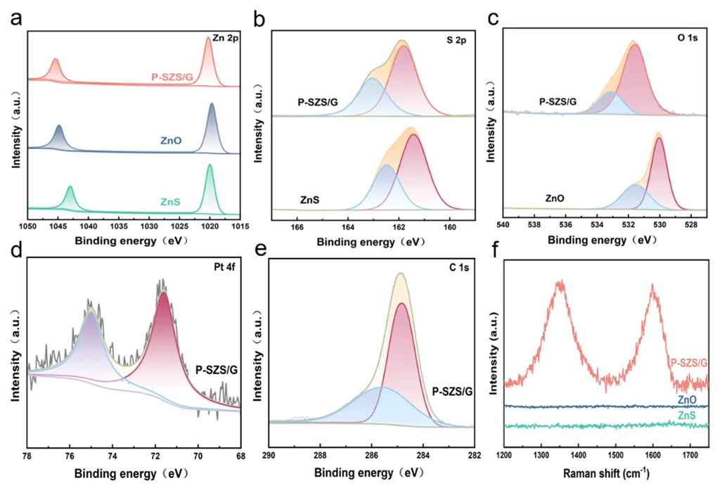 图 4. (a)ZnS、ZnO 和 P-SZS/G 中 Zn 2p 轨道的 XPS 光谱;(b)ZnS 和 P-SZS/G 中 S 2p 轨道的 XPS 光谱;(c)ZnO 和 P-SZS/G 中 O 1s 轨道的 XPS 光谱;(d)P-SZS/G 中 Pt 4f 轨道的 XPS 光谱;(e)P-SZS/G 中 C 1s 轨道的 XPS 光谱;(f)ZnS、ZnO 和 P-SZS/G 的拉曼光谱。