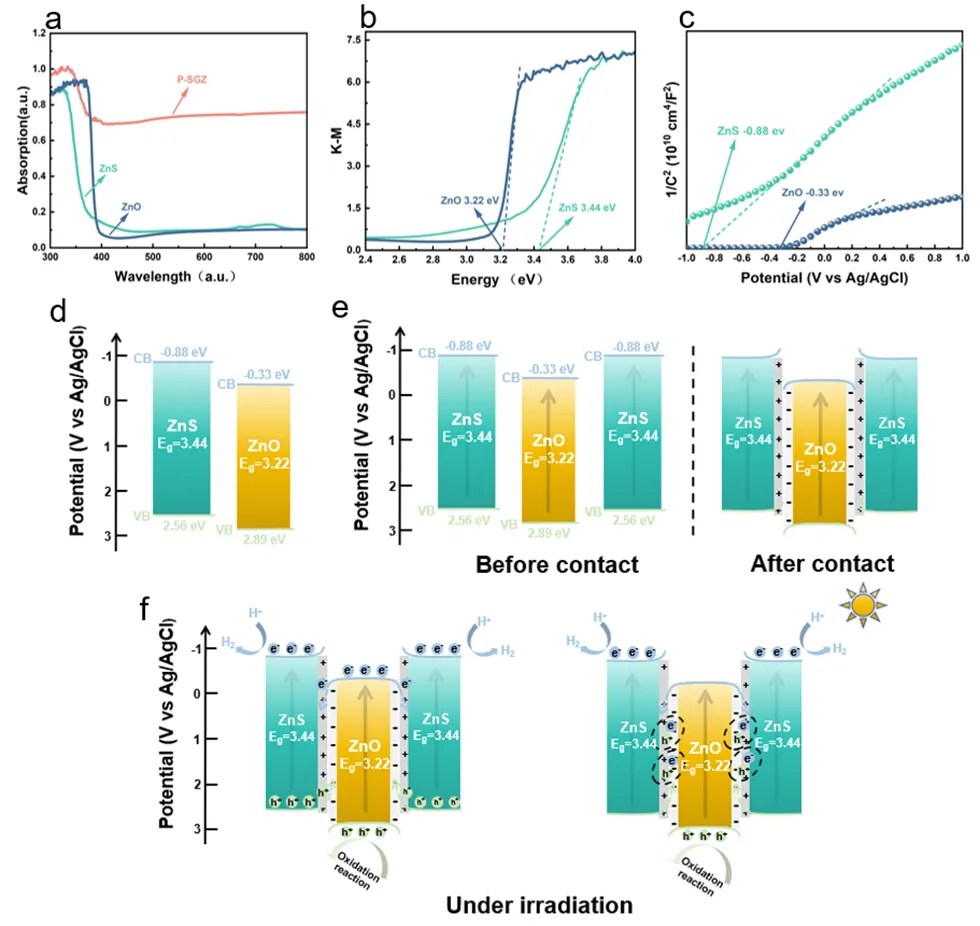 图 5. (a)ZnS、ZnO 和 P-SZS/G 的UV−Vis光谱;(b)ZnS 和 ZnO 的 K-M 变换图;(c)ZnS 和 ZnO 的Mott-Schottky曲线;(d)ZnS 和 ZnO 的能带结构;(e)和(f)P-SZS/G 的电子和光生载流子传输机制示意图。