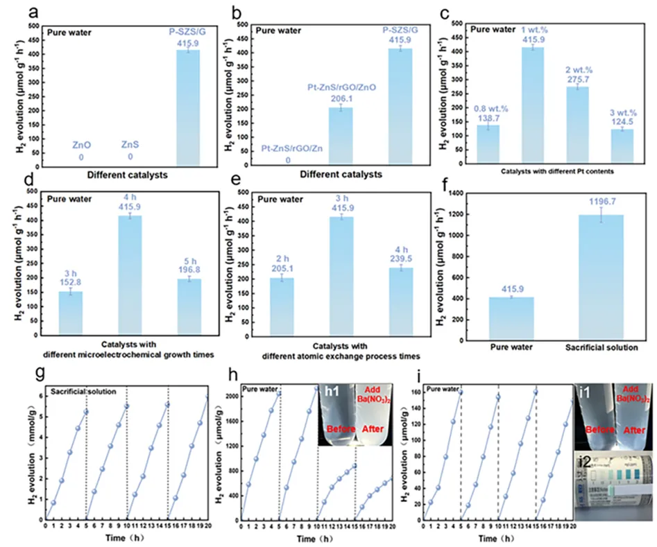 在纯水中,所构建的P-SZS/G交替异质结展现出高达415.9 μmol·g⁻¹·h⁻¹的产氢速率,性能是普通ZnS-ZnO异质结的两倍,且优于多数文献报道值。纯ZnS、ZnO及其物理混合物在相同条件下几乎无活性.在Na₂S/Na₂SO₃牺牲剂溶液中,产氢速率进一步提升至1196.7 μmol·g⁻¹·h⁻¹,表明其具有高催化潜力。在纯水中长时间循环反应后,催化剂因自腐蚀导致性能下降,并检测到副产物SO₄²⁻。经300℃煅烧1小时处理后,催化剂在纯水中表现出优异的稳定性,且无SO₄²⁻生成,检测到H₂O₂产物。表征证实煅烧形成了更致密稳定的异质结界面,促进了空穴的有效转移与分离,从而抑制了腐蚀。