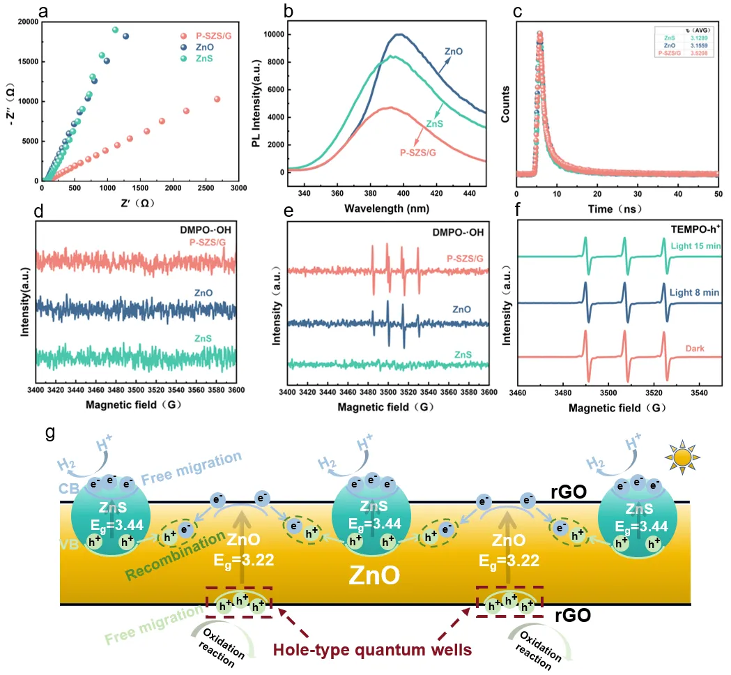 图 7.(a)P-SZS/G ZnO、ZnS 和 ZnO 的EIS;(b)P-SZS/G ZnO 和 ZnS 的PL;(c)P-SZS/G、ZnO 和 ZnS 的TRPL;(d)黑暗下 P-SZS/G、ZnS 和 ZnO 的 DMPO-·OH 的 EPR 信号;(e)光照条件下 P-SZS/G、ZnS 和 ZnO 的 DMPO-·OH 的 EPR 信号;(f)P-SZS/G 中 h+ 的 EPR 信号;(g)P-SZS/G 光催化水分解机制示意图。