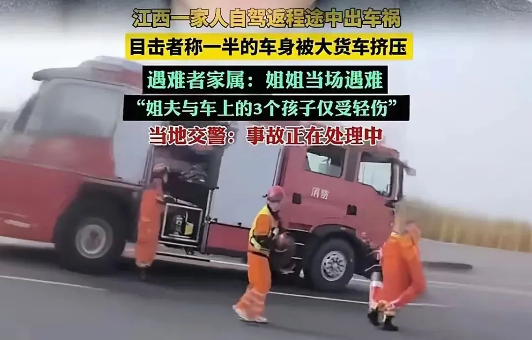 大年初七,南昌一家人高高兴兴从娘家返回,准备复工。谁也没想到,车开到吉安高速上,旁边一辆大货车突然挤压过来,直接把他们挤上护栏。目击者说,半边车身完全挤扁。姐夫和三个孩子命大,只受了轻伤,可姐姐当场没了。