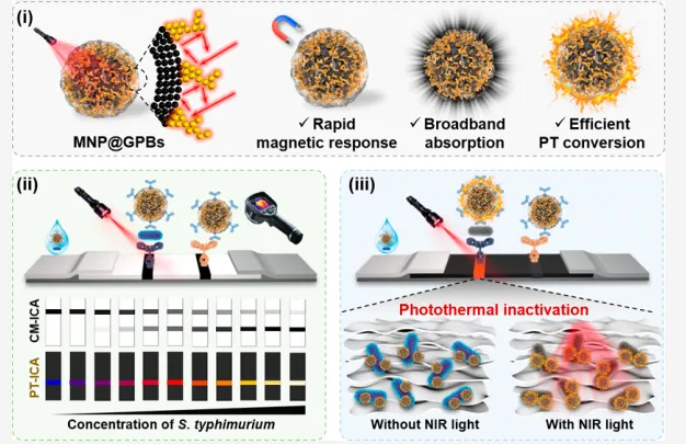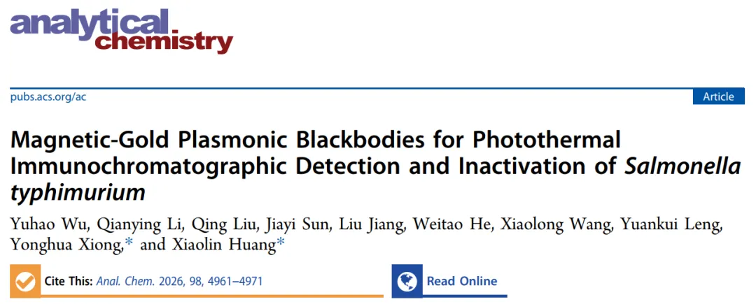 Magnetic-Gold Plasmonic Blackbodies for Photothermal Immunochromatographic Detection and Inactivation of Salmonella typhimuriumYuhao Wu, Qianying Li, Qing Liu, Jiayi Sun, Liu Jiang, Weitao He, Xiaolong Wang, Yuankui Leng, Yonghua Xiong,* and Xiaolin Huang*原文链接:https://doi.org/10.1021/acs.analchem.5c07116