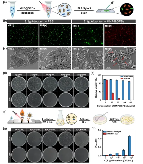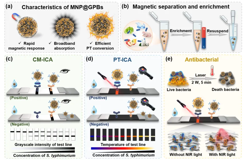 Scheme 1. Schematic Overview of the MNP@GPB-ICA Platform for the Sensitive Detection and Simultaneous Photothermal Inactivation of S. typhimurium