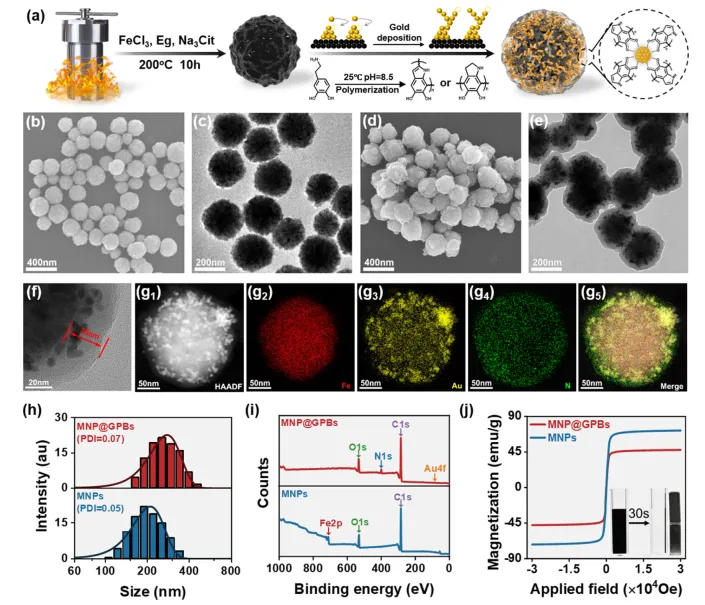 Figure 1. Characterization of MNP@GPBs. (a) Schematic illustration of the synthetic route for MNP@GPBs. Representative SEM (b) and TEM (c) images of the MNP core. SEM (d) and (e) TEM images of the synthesized MNP@GPBs. (f) High-resolution TEM (HRTEM) image of MNP@GPBs. (g) EDS elemental mapping of MNP@GPBs. (h) Hydrodynamic diameter distribution of MNPs and MNP@GPBs. (i) XPS spectrum of MNPs and MNP@GPBs. (j) Magnetization hysteresis loops of MNPs and MNP@GPBs.