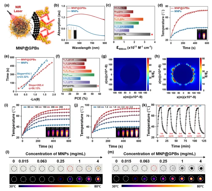 Figure 2. Colorimetric and photothermal performance of MNP@GPBs.