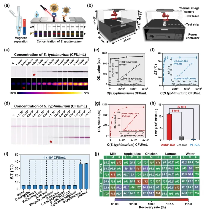总之,我们通过在磁性纳米颗粒(MNPs)表面沉积一层独特的金/聚多巴胺杂化层,合成了 MNP@GPB 纳米复合材料。这有效地解决了磁性光热纳米材料常见的挑战,如光逃逸和磁屏蔽。所得的 MNP@GPB 表现出卓越的胶体稳定性、宽带吸收、高效的光热转换(η = 56.13%)以及快速的磁响应(饱和磁化强度为 47.5 emu/g)。随后,我们将这些纳米复合材料应用于开发一种光热免疫层析平台,用于高灵敏度检测和同时灭活鼠伤寒沙门氏菌。定量分析表明,在 CM-ICA 中的检测限为 1.4×10³ CFU/mL,在 PT-ICA 中为 3.4×10² CFU/mL,分别比传统的 AuNPs-ICA 提高了 8 倍和 32 倍的灵敏度。集成的磁分离和双信号读出确保了在复杂食品基质中的可靠性能。最重要的是,MNP@GPB 不仅提高了检测灵敏度,还能在测试线上光热灭活残留的鼠伤寒沙门氏菌,降低了二次细菌污染的风险。综合来看,MNP@GPBs 为设计高性能磁性光热纳米复合材料提供了一种有前景的策略,而 MNP@GPB-ICA 则为开发灵敏且安全的细菌检测平台提供了一种通用且有效的方法。