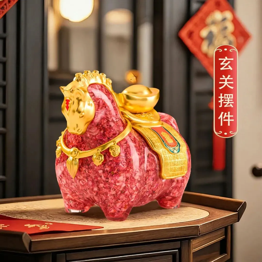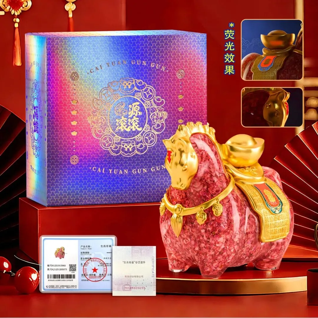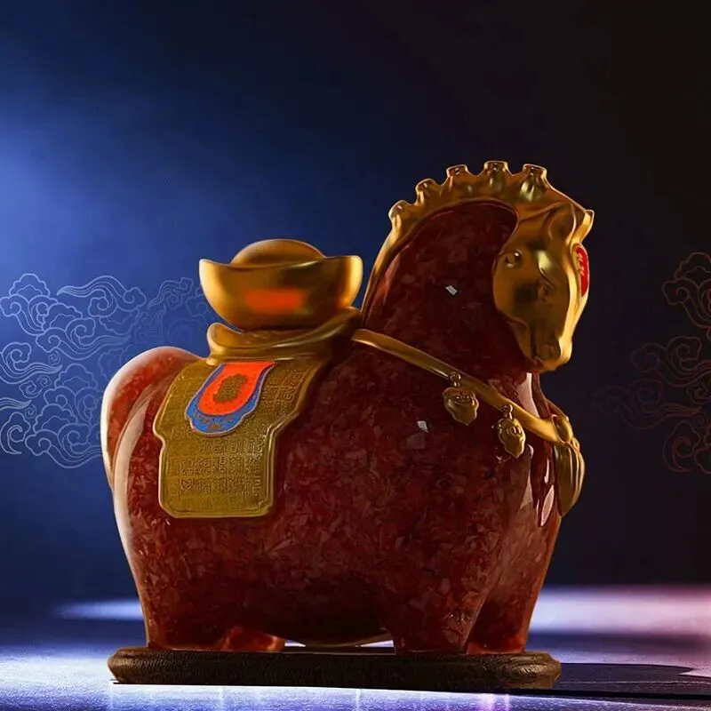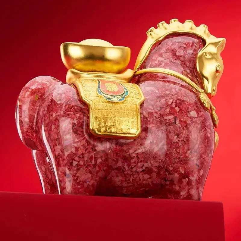 马身为高透树脂融合人民币百元钞碎屑,赤色流转,华而不炫,象征红运聚财、根基沉稳。