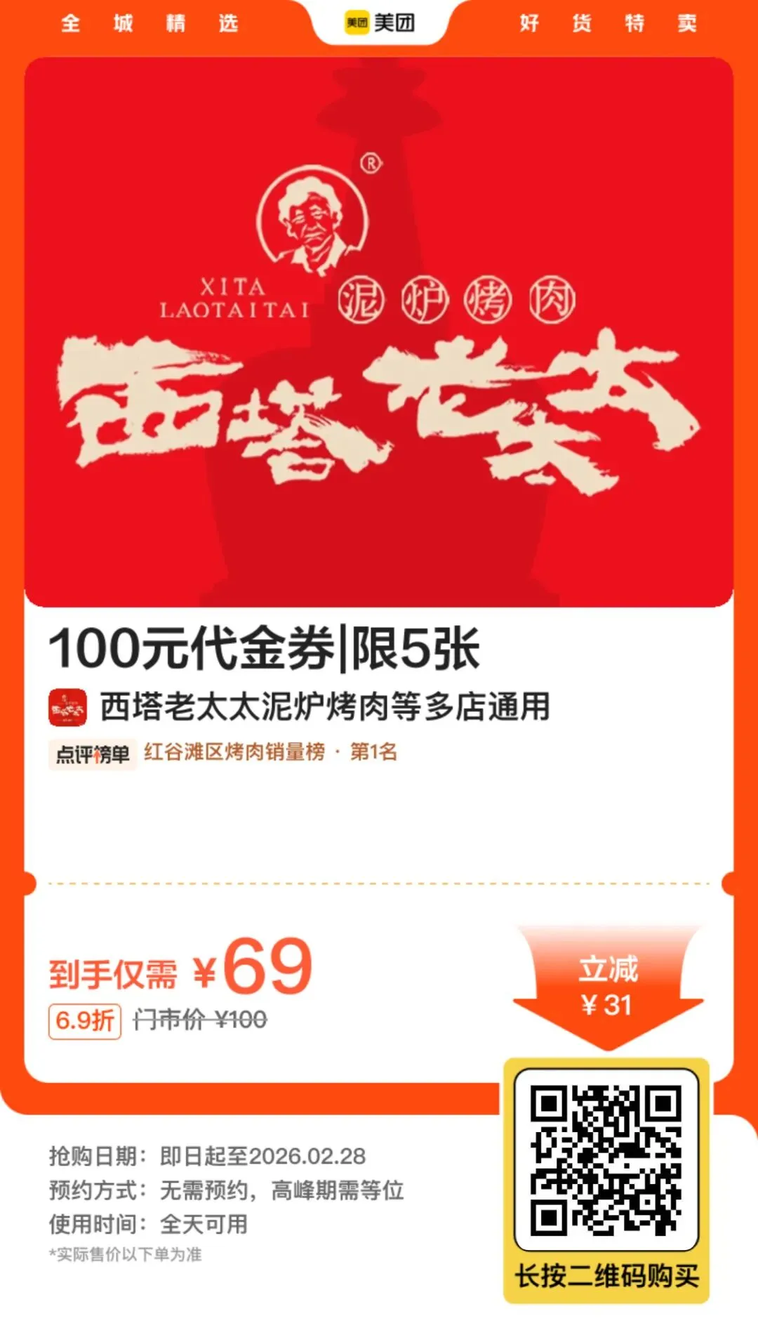 南昌通用「西塔老太太」优惠券:69抵100,207抵300可叠加
