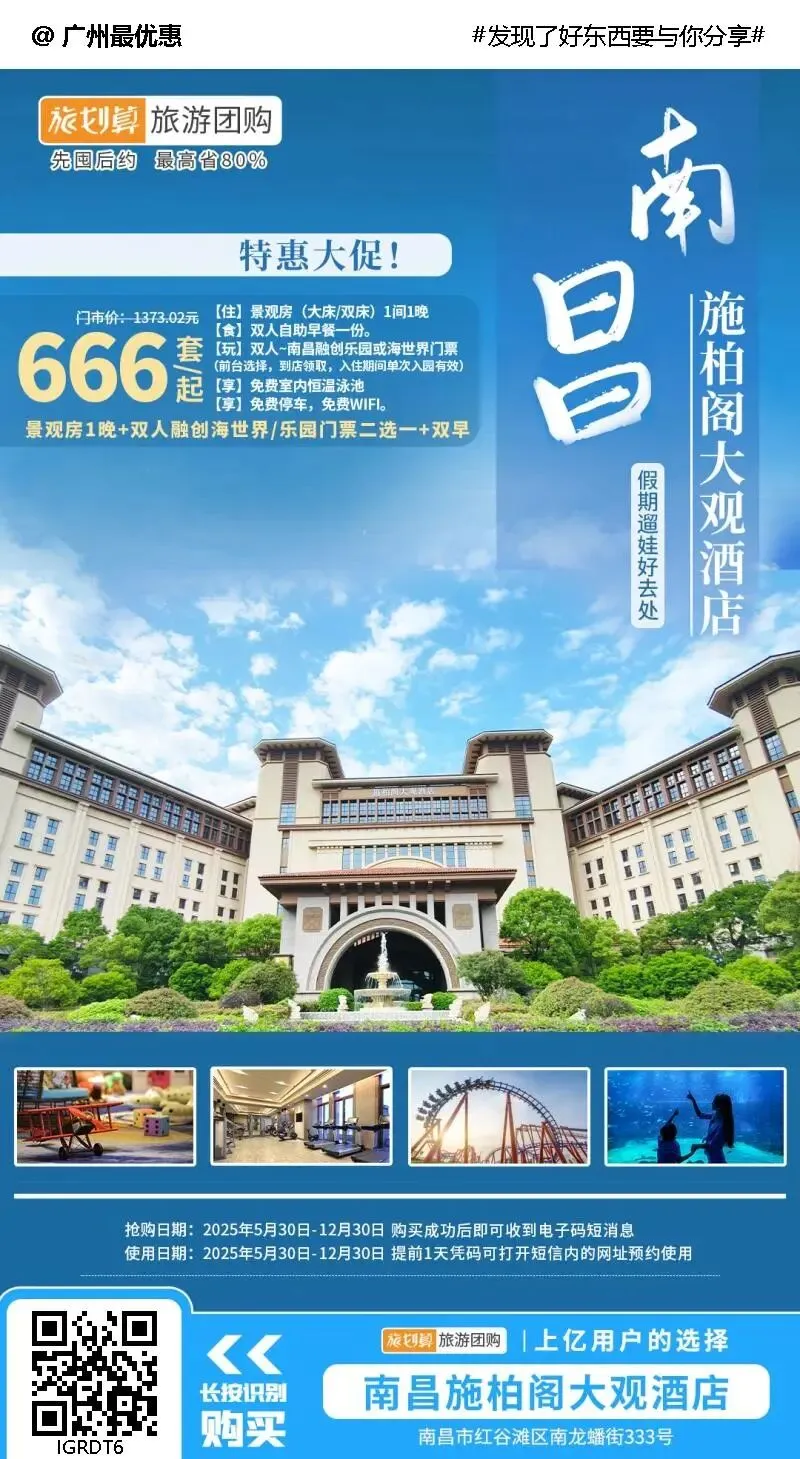 ¥666抢南昌施柏阁大观酒店景观房+双早+双人乐园或海世界2选1!799起抢2大1小套餐!假期遛娃好去处一站式畅玩融创文旅城