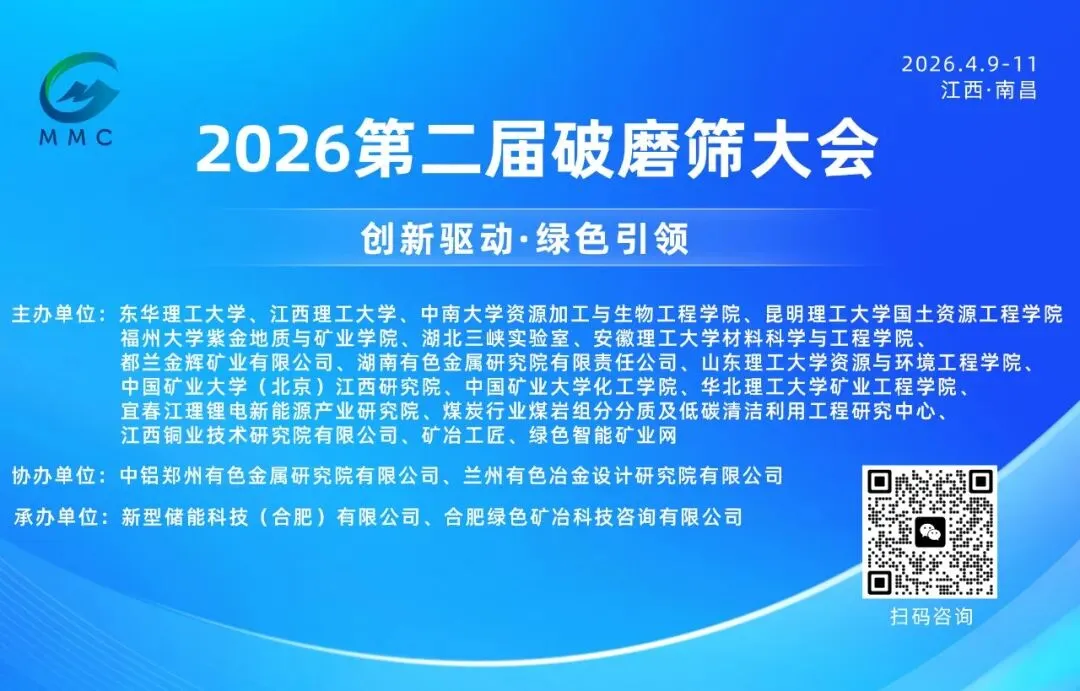 为积极响应国家绿色低碳循环发展战略,推动产业转型升级,由东华理工大学、江西理工大学、中南大学资源加工与生物工程学院、昆明理工大学国土资源工程学院、福州大学紫金地质与矿业学院、湖北三峡实验室、安徽理工大学材料科学与工程学院、都兰金辉矿业有限公司、湖南有色金属研究院有限责任公司、山东理工大学资源与环境工程学院、中国矿业大学(北京)江西研究院、中国矿业大学化工学院、华北理工大学矿业工程学院、宜春江理锂电新能源产业研究院、煤炭行业煤岩组分分质计低碳清洁利用工程研究中心、江西铜业技术研究院有限公司、矿冶工匠、绿色智能矿业网等权威机构联合主办,中铝郑州有色金属研究院有限公司、兰州有色冶金设计研究院有限公司等单位协办的“2026第二届破磨筛大会”将于2026年4月9-11日在江西南昌隆重举行。本届大会以“创新驱动,绿色引领”为主题,旨在构建产学研用深度融合的交流平台,共同推进破磨筛技术在现代产业体系中的创新应用与高质量发展。
