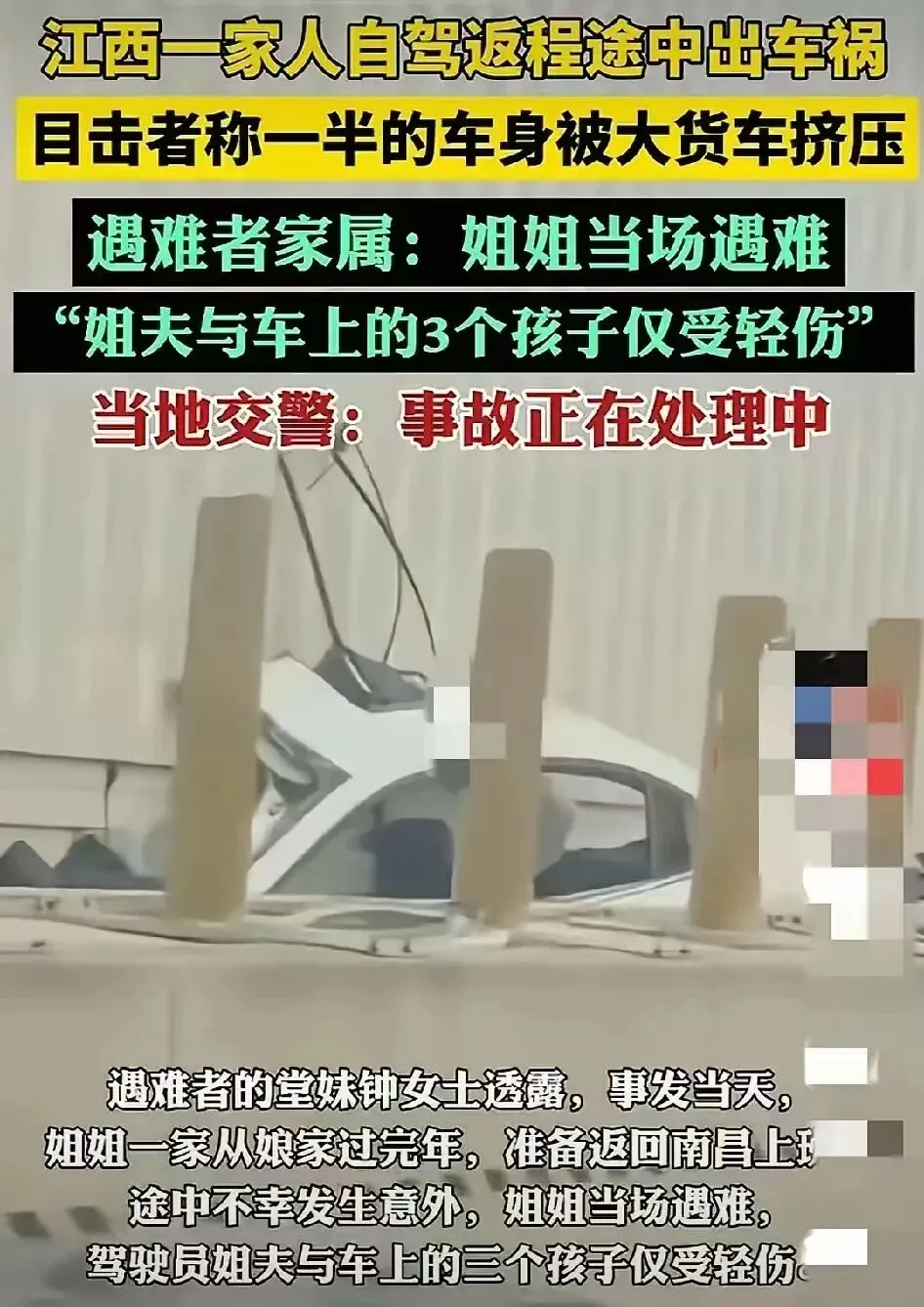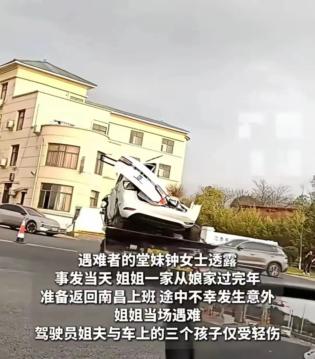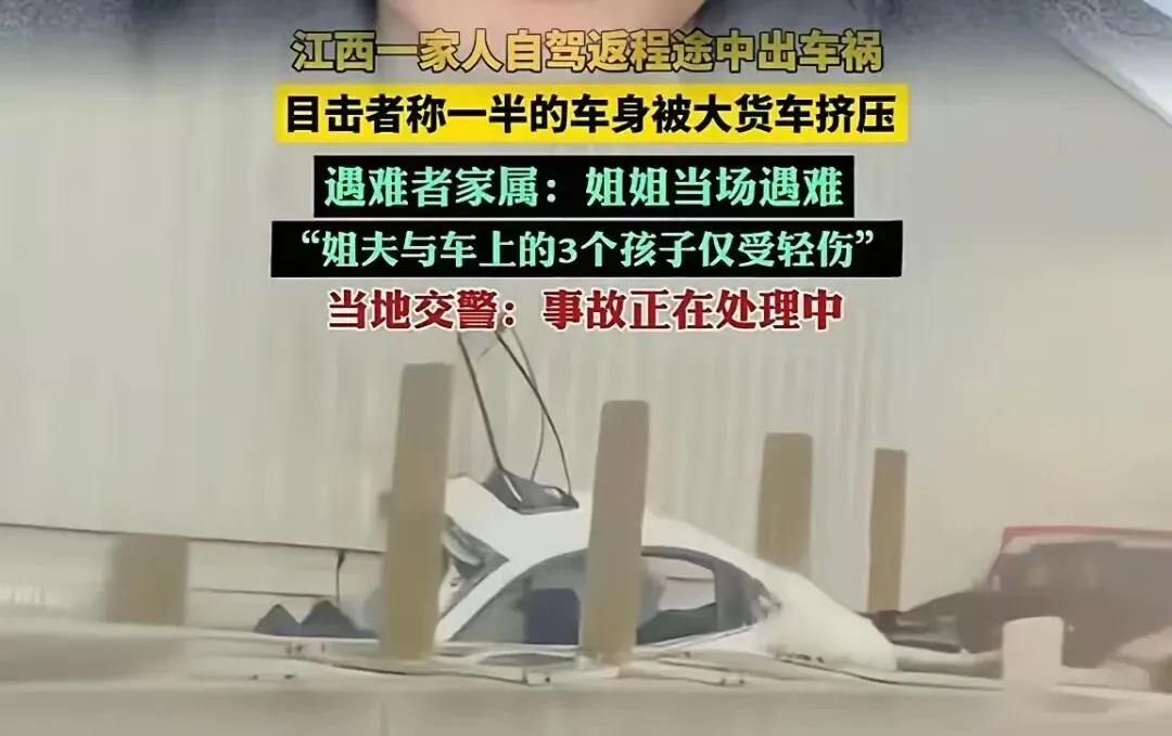 大年初七,江西一家五口返程南昌途中遭遇高速车祸,副驾女子不幸身亡,丈夫与三个孩子仅受轻伤。目击者称,小车被大货车挤压,车身严重损毁。