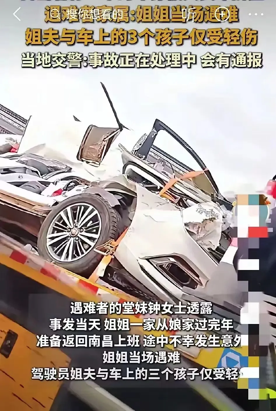 农历大年初七,过年的喜庆劲儿还没有完全散去,江西一家人返程途中遭遇车祸。遇难女子的堂妹说,姐姐一家年后返回南昌上班,途中被大货车挤压成“铁片”。第一段动图中几乎看不到这辆白色小车,只能听到拍摄视频者的惊呼。