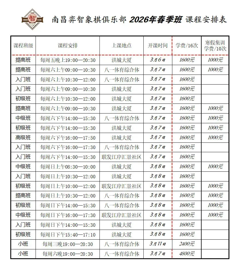 南昌弈智象棋俱乐部2026年春季班将于3月开课,5岁以上(零基础)的小朋友可报名学棋,欢迎有志于开发少儿智力的家长前来联系、咨询。→ 老带新均可获赠50元学费抵扣券。