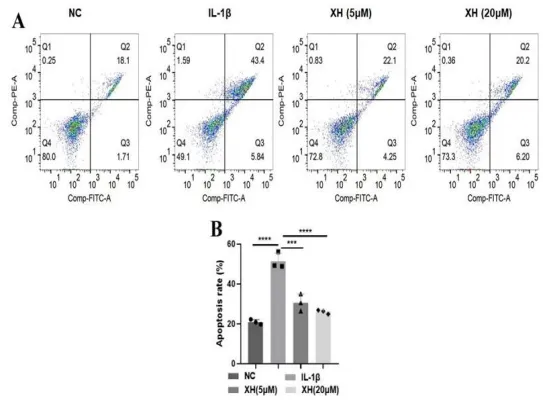 图1:流式细胞术检测XH抑制体外IL-1β诱导的软骨细胞凋亡。A-B:各组软骨细胞凋亡率。“NC”是正常组,“IL-1β”是 IL-1β 处理组,“XH(5 μM)”是 IL-1β+5 μM XH 处理组,“XH(20 μM)”是 IL-1β+20 μM XH 处理组。