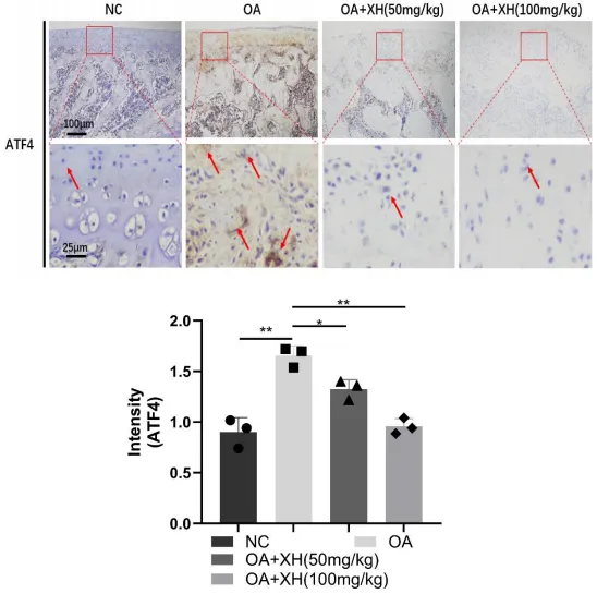 图2:免疫组织化学检测XH调节体内软骨细胞中ATF4蛋白的表达。(红色箭头代表ATF4蛋白表达数量)