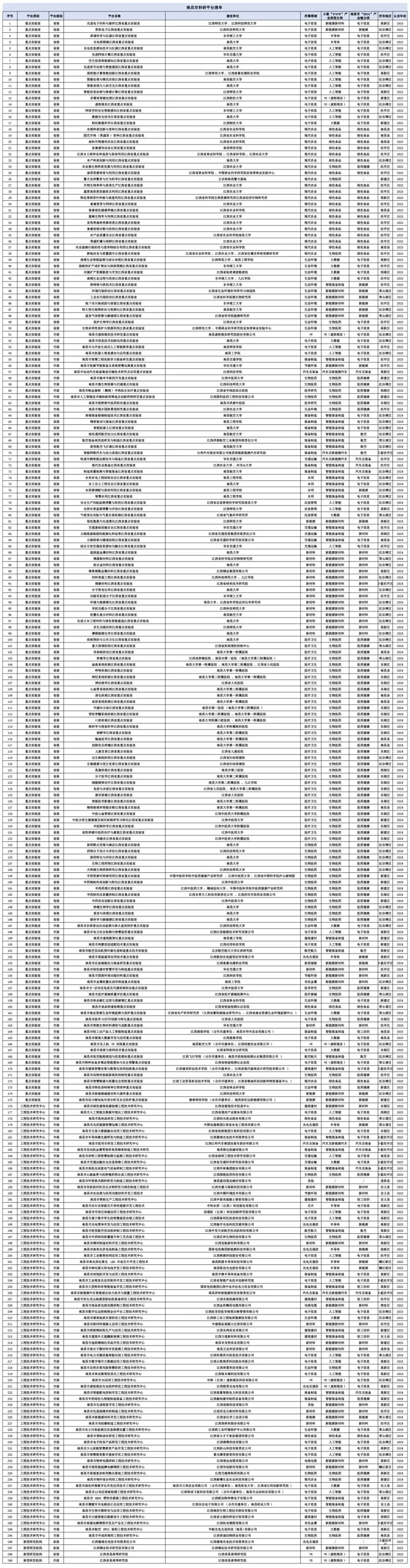 本文整理了近三年的249所南昌市科研平台清单,重点实验室175家、工程技术研究中心70家、新型研发机构4家,其中省级平台136家、市级平台113家。建设单位包括企业、院所、学校、医院,部分平台由企业、大学与高校合作共建等。这些领域覆盖电子信息、现代农业、装备制造、生物医药等。这些研发平台的科研成果不仅有助于企业转型升级,还将带动相关产业链的协同创新,促进南昌经济高质量发展。