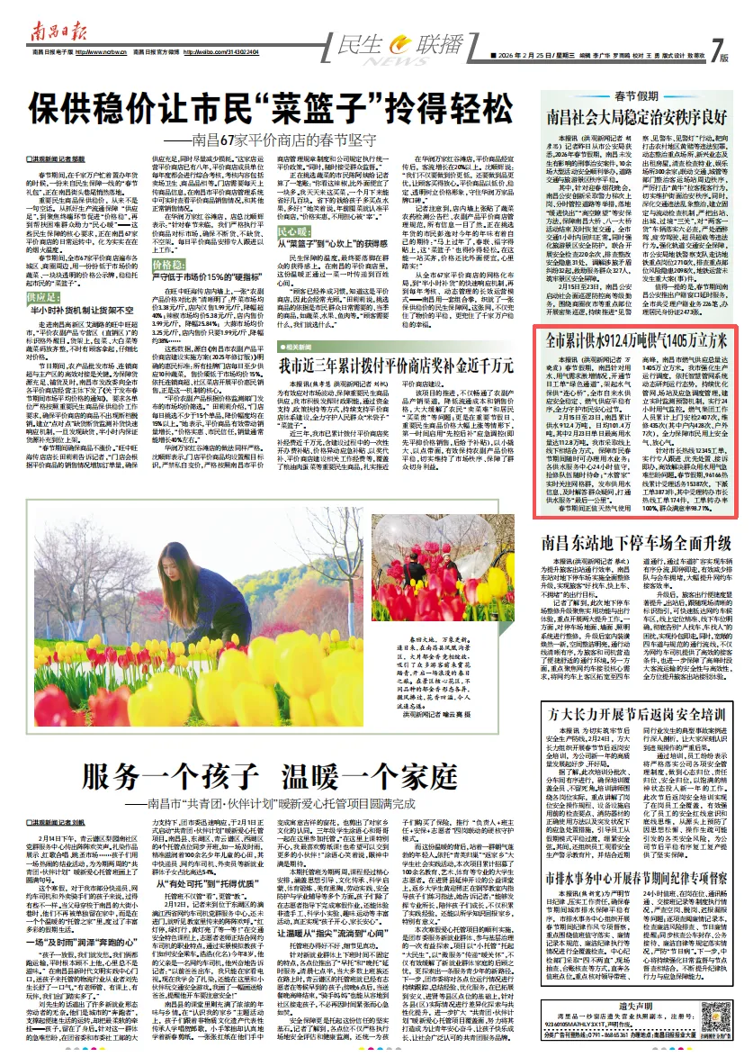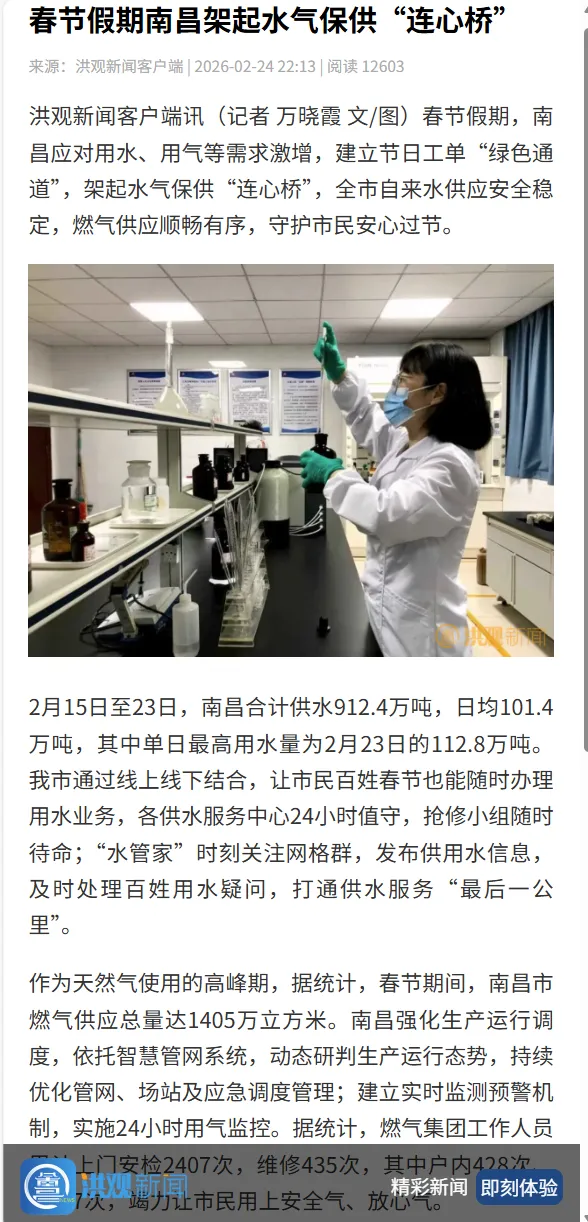 春节假期,南昌应对用水、用气等需求激增,建立节日工单“绿色通道”,架起水气保供“连心桥”,全市自来水供应安全稳定,燃气供应顺畅有序,守护市民安心过节。