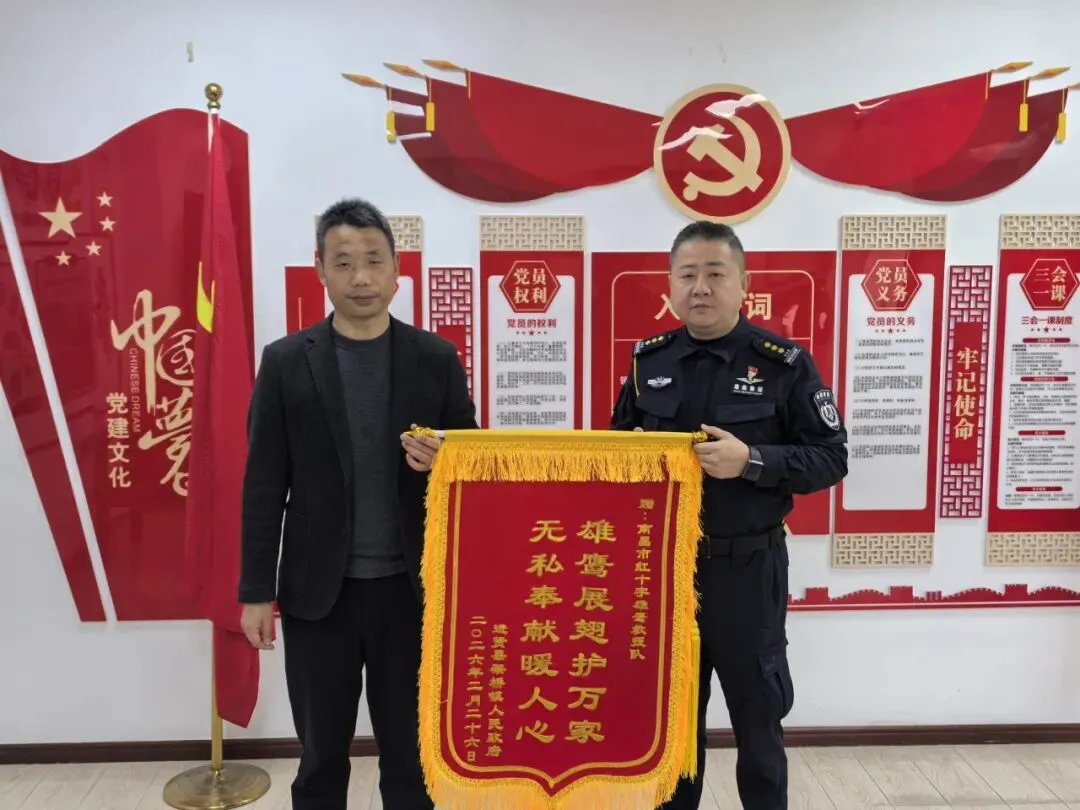 救援行动圆满结束后,为表彰南昌市红十字雄鹰救援队的突出贡献,进贤县架桥镇人民政府特意制作了锦旗,郑重赠予救援队。锦旗上的鎏金大字,不仅承载着当地政府对救援工作的高度肯定,更饱含着群众对救援队员的深深敬意与衷心感谢,是对救援队“向险而行、守护生命”担当精神的最好诠释。