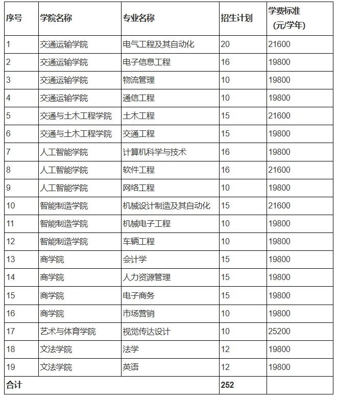 表1 南昌交通学院2026年退役士兵免试专升本招生计划一览表