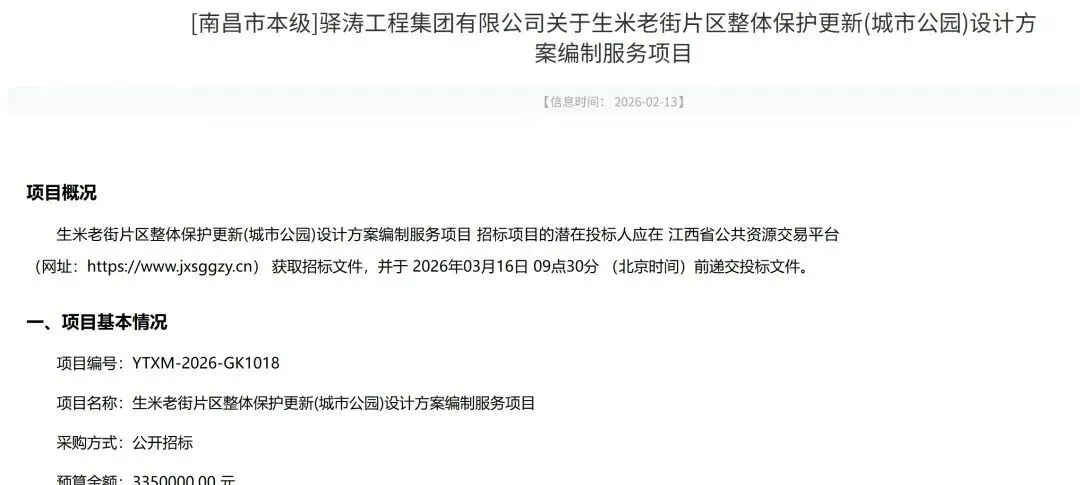 近日,江西省公共资源交易网发布了关于生米老街片区整体保护更新(城市公园)设计方案编制服务项目招标公告。项目编号为YTXM-2026-GK1018,项目预算金额3350000.00元,最高限价3232686.12元。