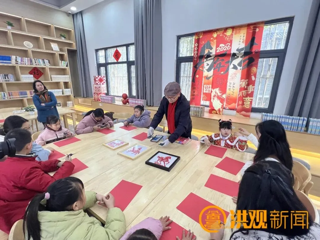 在孺子书房朱桥梅村分馆,从民间剪纸的起源发展,到传统纹样里暗藏的“福、禄、寿、喜”美好寓意,再到剪刀与红纸碰撞出的艺术巧思,“书香话年俗·文脉续新章”——新春年俗读书会特邀市级非遗项目“青云谱剪纸”代表性传承人刘鹏深入浅出地进行讲解,让非遗的种子在孩子们心中悄然生根。小读者汪梓涵拿着自己亲手剪的剪纸作品,兴奋地说:“老师讲得特别有意思,我学到了很多知识,这是我今年收到的最特别的新年礼物。”