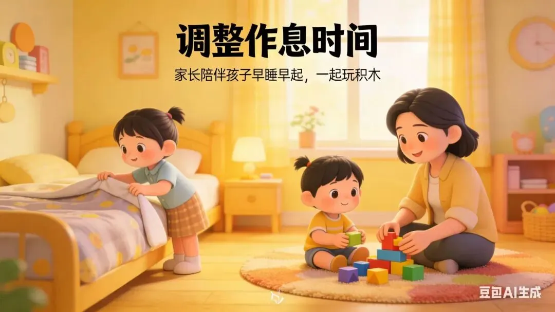 假期最后几天,建议家长按幼儿园作息让孩子早睡早起、按时午睡,减少看电视时间,多陪孩子读绘本、搭积木,平复浮躁情绪,逐步进入入园状态