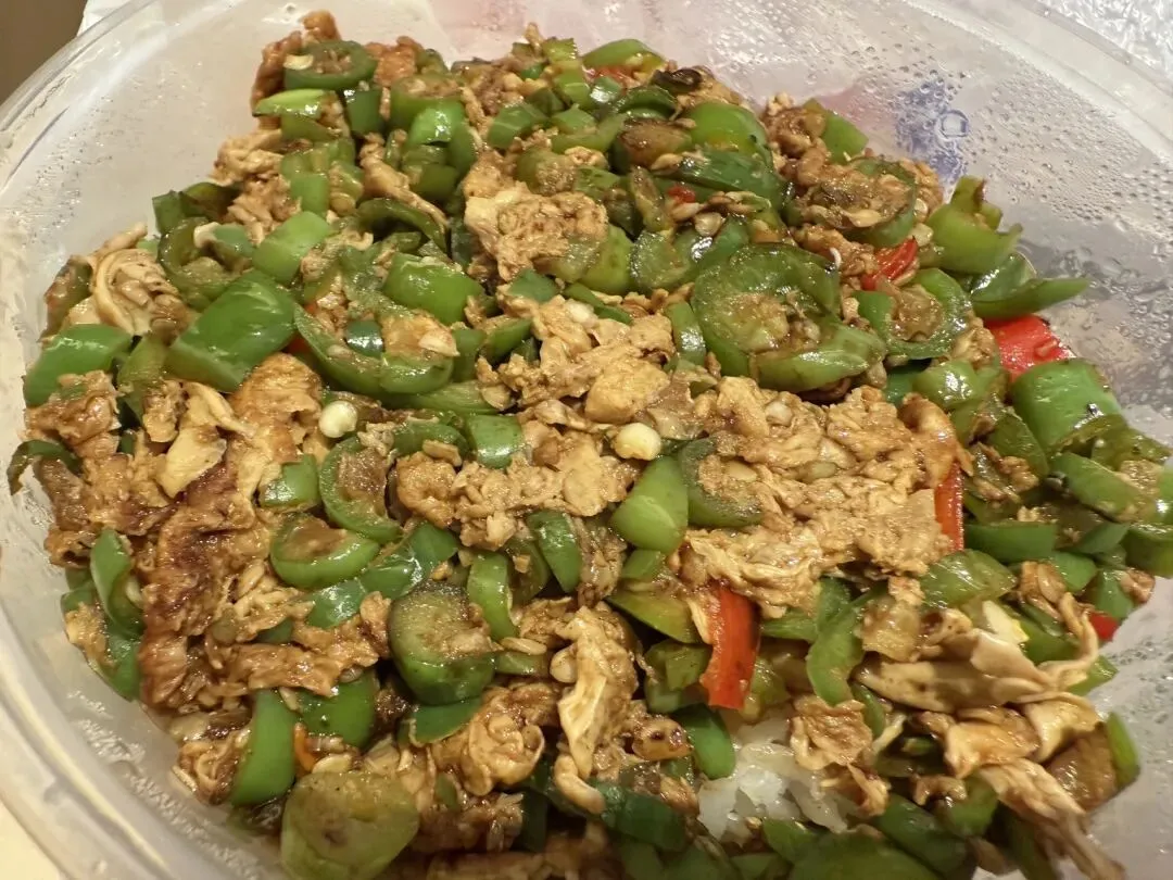 还有就是我平时不怎么能吃辣,江西菜的辣度真的远超我极限,我有一次点了个辣椒炒蛋盖饭的外卖,一打开盖子,立刻把我劝退了……跟你们看看下面图片,我挑着鸡蛋吃了几口。脑门儿立刻冒汗……