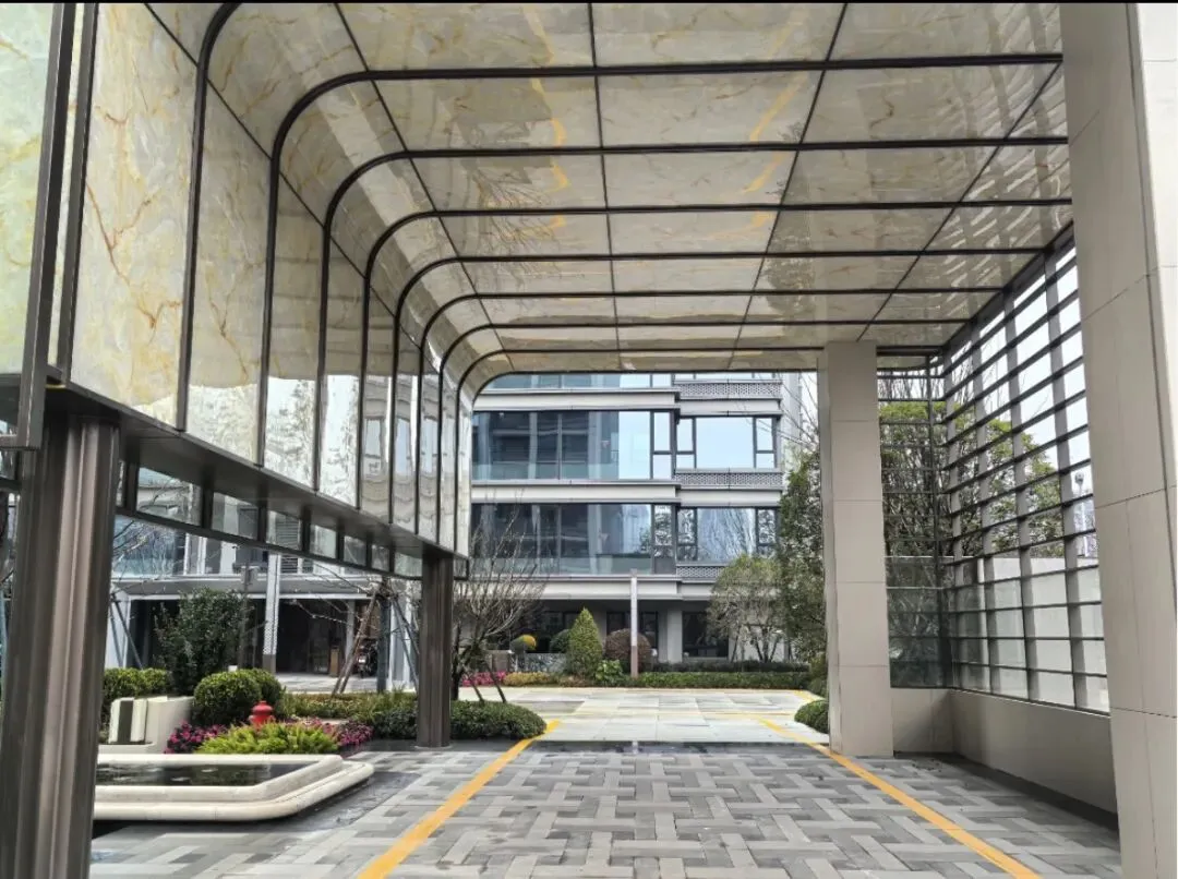 小区大门用了大量奢石铺贴,顶部采用窗孔铝板,虽然宽度一般,但实景看档次是不低的。