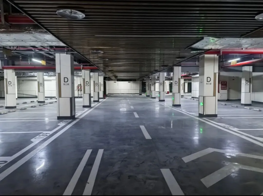 小区地库,过道采用铝板吊顶,地面采用石磨石工艺,整体还行。