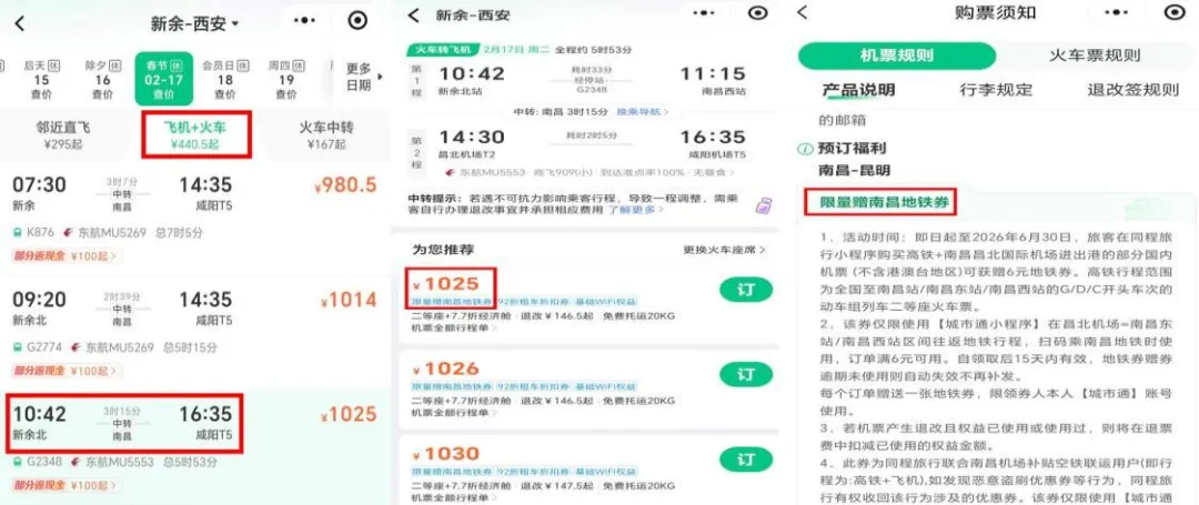 空铁联运,打通出行“最后一公里”。联合同程旅行为符合条件的空铁联运旅客提供专属出行补贴——免费发放南昌东站/南昌西站至南昌机场站6元地铁优惠券。切实降低联运成本,提升综合交通出行体验。旅客张先生表示:“从高铁站转地铁去机场,几块钱的补贴虽小,但感觉很贴心,真正为旅客着想。”
