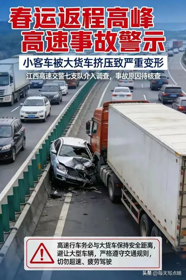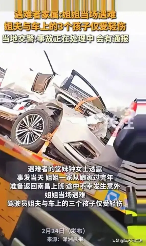 刚过完年,后备箱还装着家乡的味道,孩子在后座睡得安稳,谁也想不到,这趟普通返程,会变成永别。2月24日江西大广高速,一家五口自驾返岗,小车被货车狠狠挤扁在护栏,母亲当场遇难,丈夫与三个孩子侥幸生还。团圆的余温还没散,家就碎了。