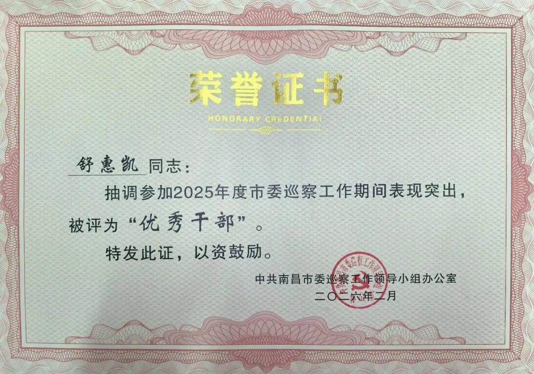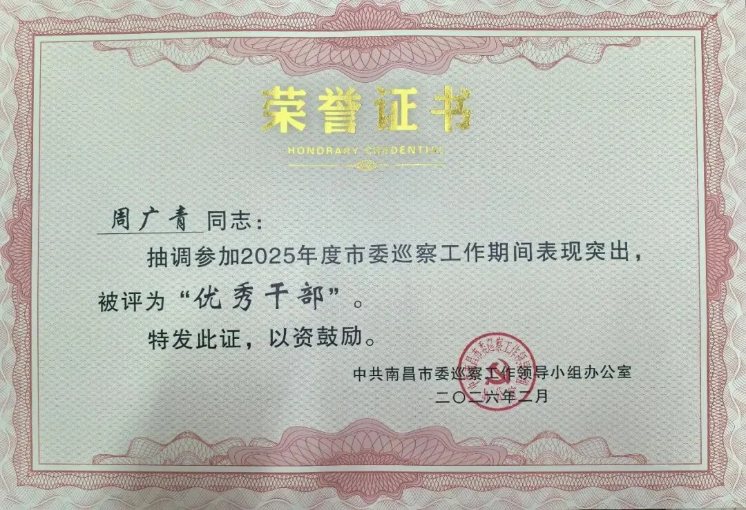 近日,从中共南昌市委巡察工作领导小组办公室传来喜讯。南昌市政开发集团周广青同志、舒惠凯同志在抽调参加2025年度市委巡察工作期间,凭借过硬的政治素质、扎实的业务能力和严谨的工作作风,出色完成了各项巡察任务,表现突出,双双被评为“优秀干部”。