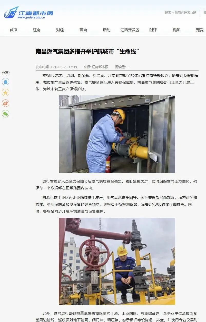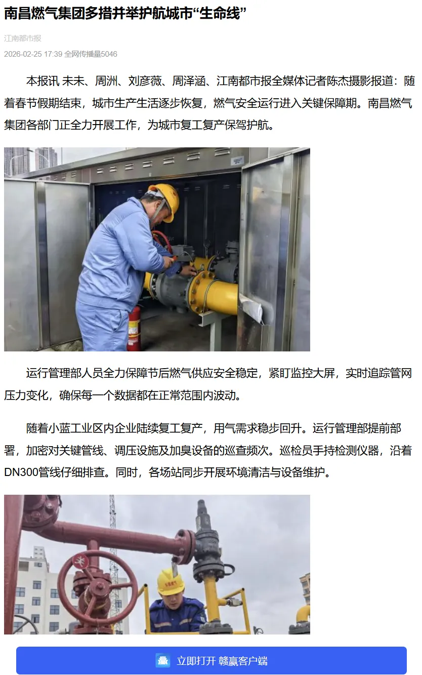 本报讯 未未、周洲、刘彦薇、周泽涵、江南都市报全媒体记者陈杰摄影报道:随着春节假期结束,城市生产生活逐步恢复,燃气安全运行进入关键保障期。南昌燃气集团各部门正全力开展工作,为城市复工复产保驾护航。