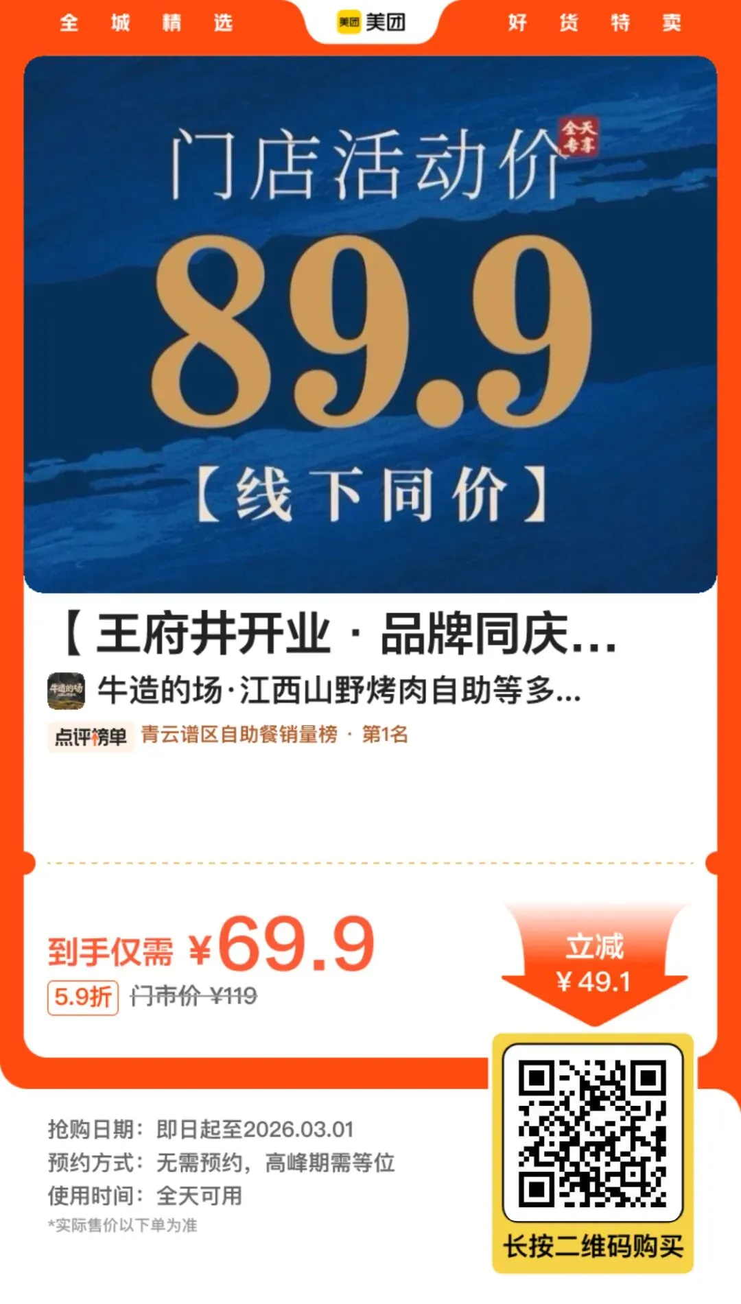 南昌「牛造的场」优惠券:69/位,限时特价