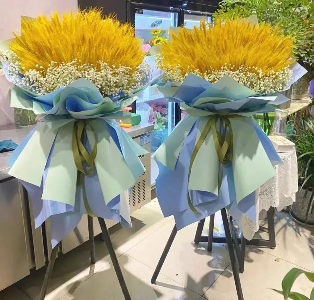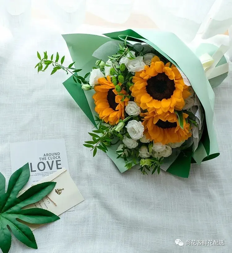 材料向日葵3枝,白色洋桔梗0.5扎,绿色小雏菊2枝,雪柳0.1扎