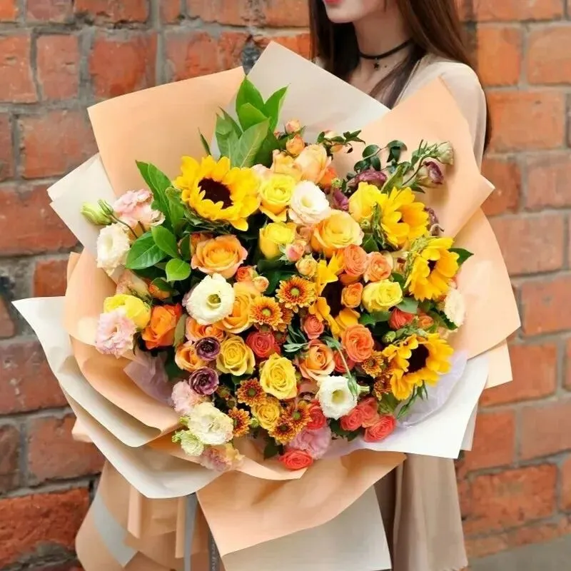 爱如阳光-香槟玫瑰3枝、向日葵2枝、粉红雪山玫瑰3枝、绿色洋桔梗3枝、橙色多头玫瑰2枝、尤加利叶5枝