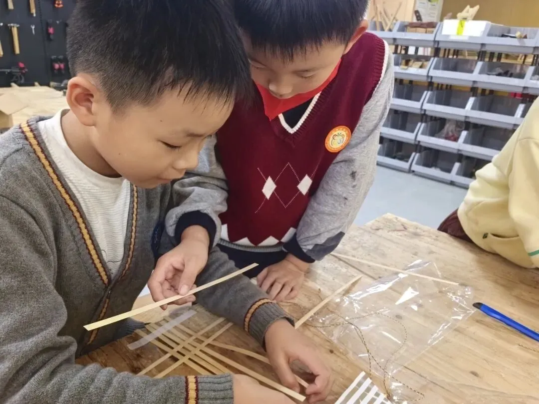 经过老师的一番讲解,大家已经跃跃欲试,开始互相探讨研究。孩子们轻巧地将竹篾穿梭于指尖,排列方式、疏密程度都可以根据自己的喜好进行选择制作。一挑一压,竹条在指尖交互缠绕,散乱的蔑片经过大家巧手的编织渐渐有了形状。