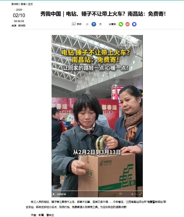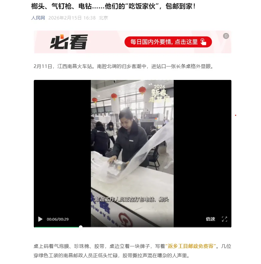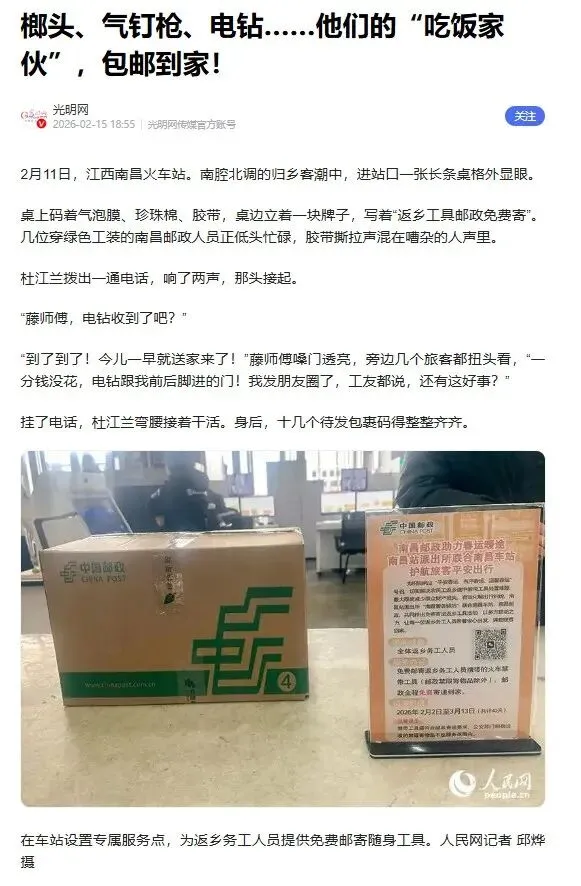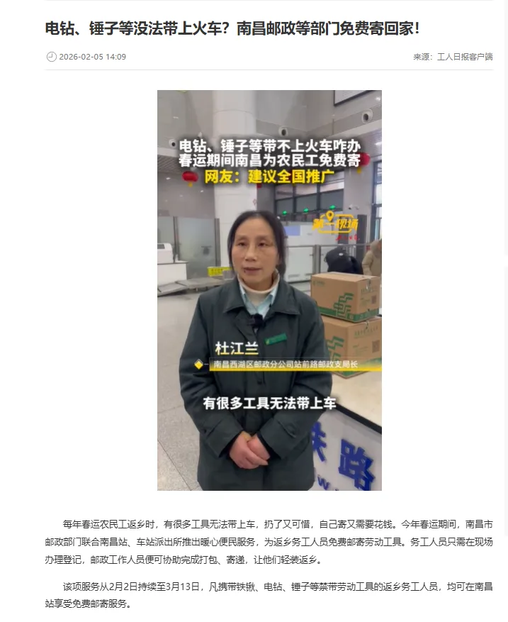 2026年春运期间,南昌邮政直击农民工群体“急难愁盼”问题,联合南昌火车站派出所、南昌火车站设立“暖心服务点”,为返乡务工者无法随身携带上车的各类劳动工具提供免费邮寄服务,引发社会热烈反响。