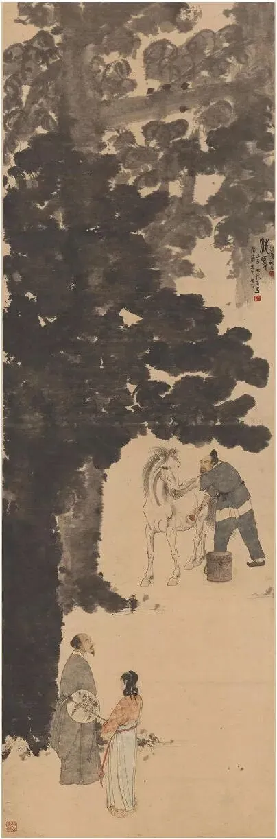 傅抱石、徐悲鸿《洗马图》轴纸本设色175x57厘米1942年6月