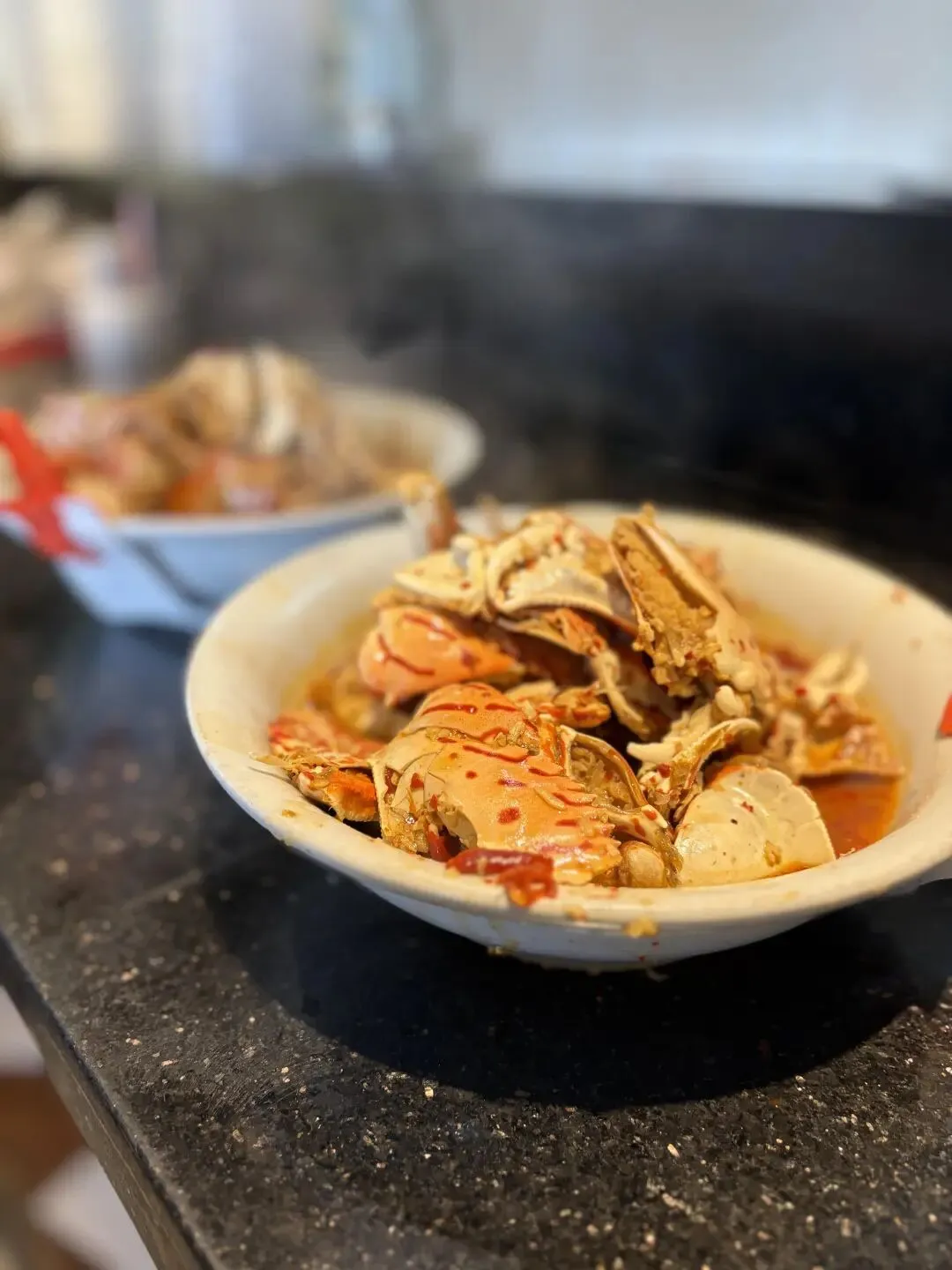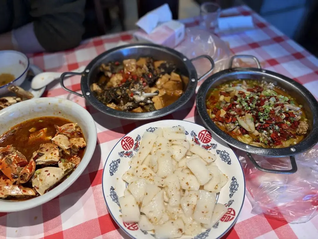 青山湖区的兴茂蟹脚特色蟹脚太香了👍、蟹脚听说放了酒糟,辣味中透露着一丝鲜甜,越吃越好吃,就是后劲有点足很辣,吃不了辣的注意点,红烧牛蛙有很多青花椒,麻麻辣辣的,很下饭,黄丫头是汪刺,感觉可以多放点水,做成红烧汤,桂花年糕很解腻,不是很甜,中国人会喜欢的微甜口感。