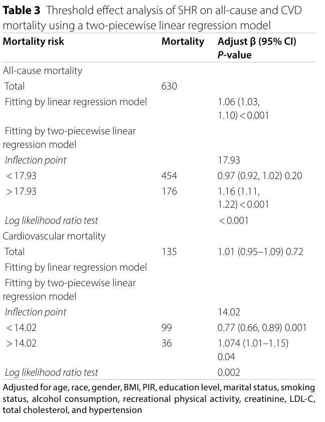 表3.使用两段线性回归模型对SHR对全因及心血管疾病死亡率的阈值效应分析