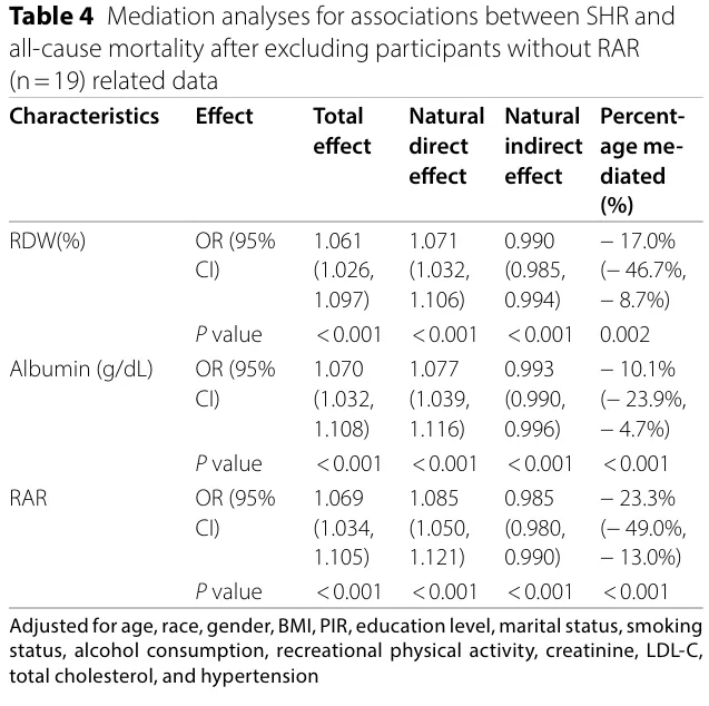 表4.排除无RAR相关数据的参与者后,SHR与全因死亡率关联的中介分析(n=19)