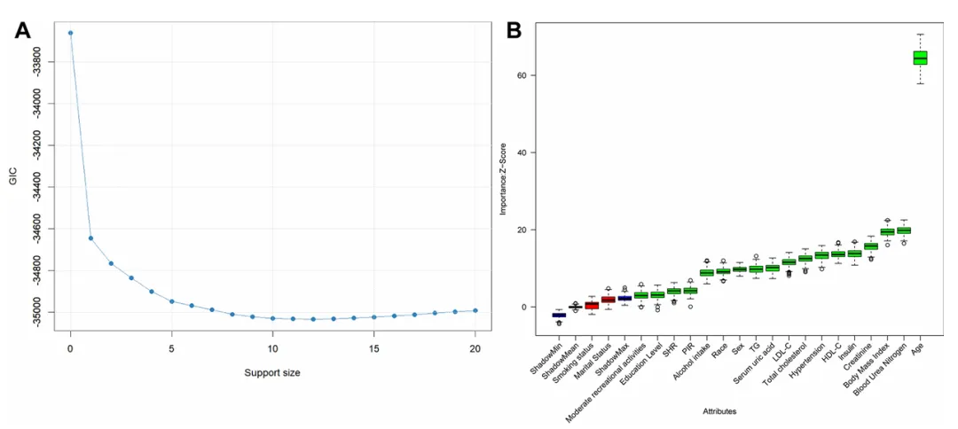 图3.在变量选择阶段采用ABESS算法(A)和Boruta算法(B)