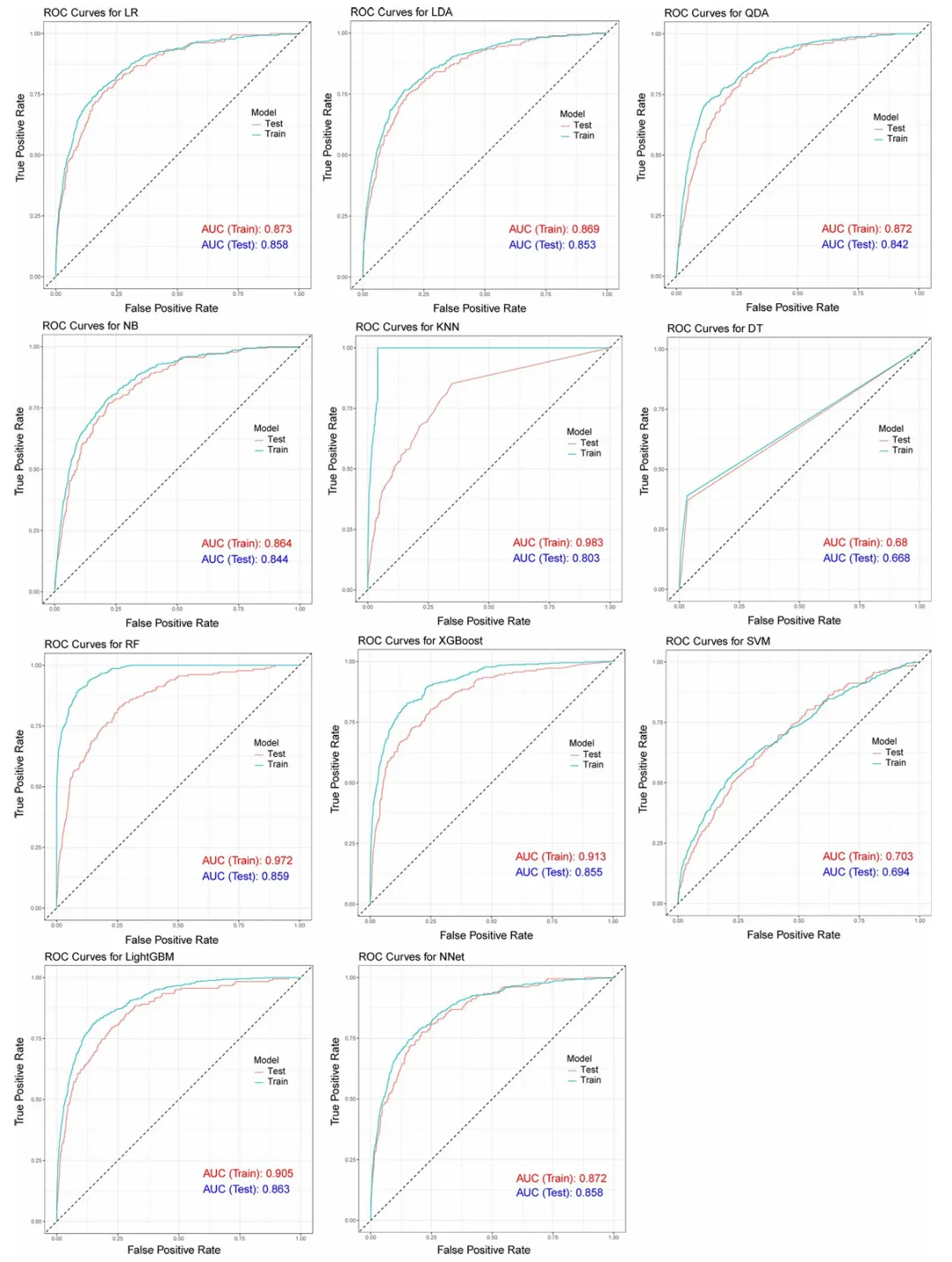 模型性能(图 4):构建 11 种机器学习模型,8 种测试集 AUC 超 0.80,LightGBM 模型最优(AUC=0.863),平均精准度 0.987、准确率 0.940、F1 值 0.969;