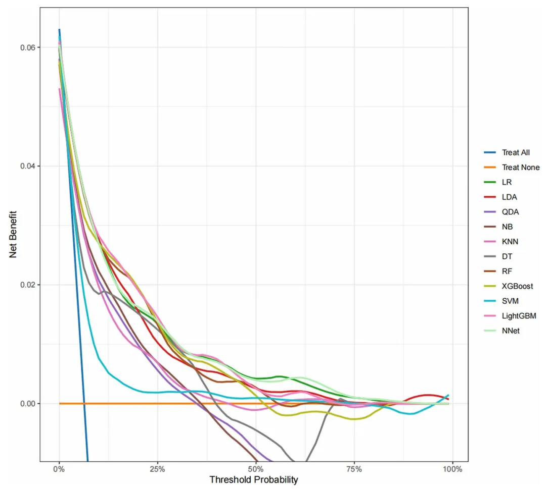 图5.DCA在不同风险阈值下展示净收益,比较十个模型