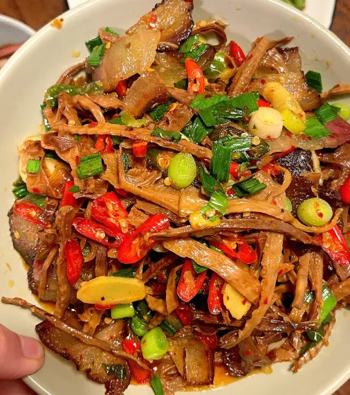 一定要尝尝这里的烟笋炒腊肉。笋是山里挖的,晒干后带着阳光味,腊肉是农家熏的,透亮。大火一爆,辣椒段一下,腊肉的油脂渗进笋里,嚼起来咯吱响。不是那种精致的摆盘菜,但每一口都是扎实的烟火气,又辣又香,能下三碗饭。