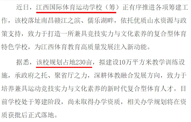 据悉,该校规划占地230亩,拟建设10万平方米教学训练设施,承政府之托、聚省厅之力,深耕体教融合发展方向,致力于培养兼具运动竞技实力与文化素养的新时代复合型体育人才。目前学校处于筹建阶段,尚未取得办学资质,相关办学规划将在资质获批后正式落地。